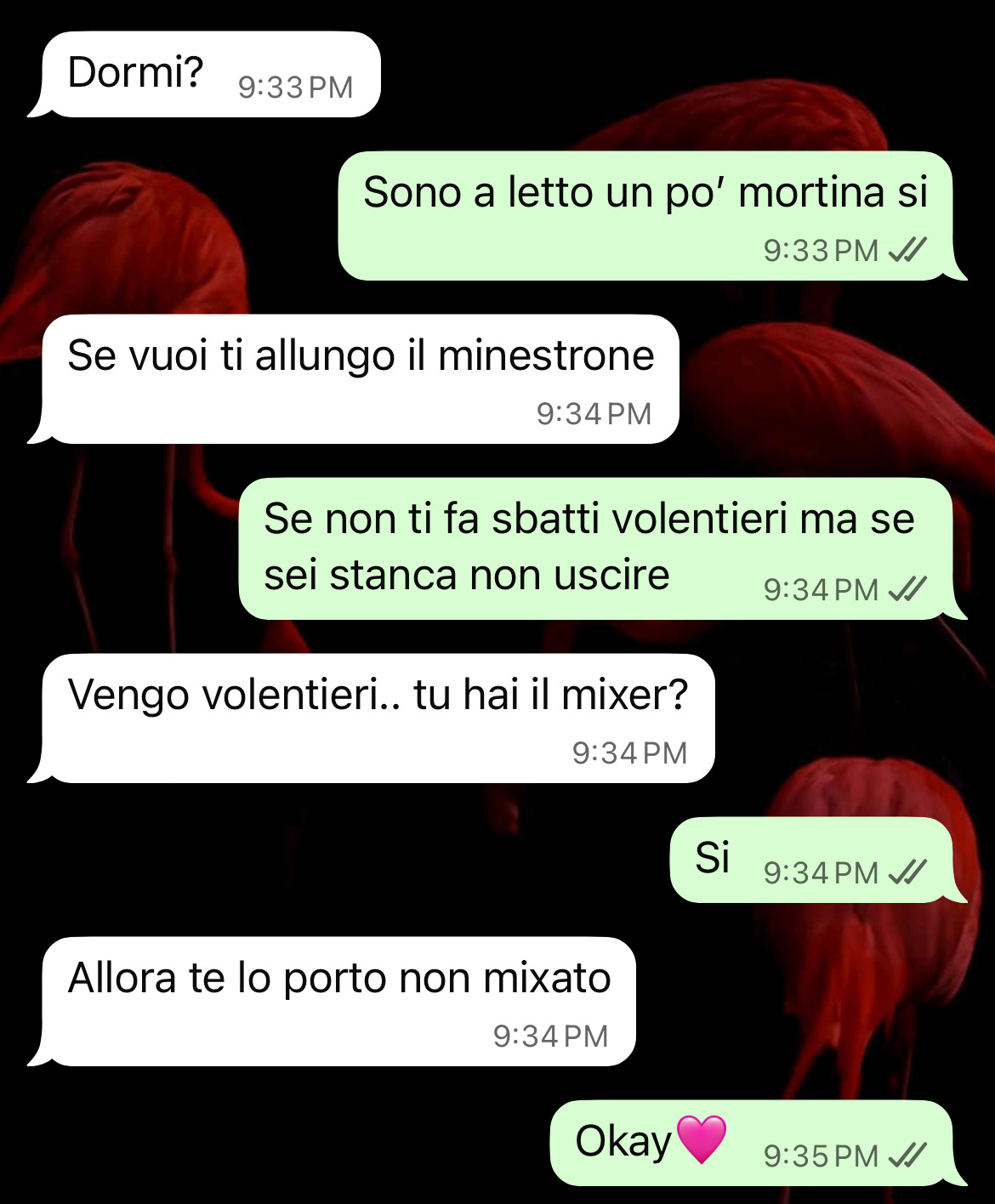 Ah no, oggi c’è luna nuova, vedi: sto già molto meglio. Due sere fa pensavo così invece già stamattina stavo bene ed ero dentro di me, e non guardavo i corpi degli altri con il desiderio di abitare le loro vite invece della mia: guardavo il mondo come fosse il liquido dentro cui io e la mia vita ci muoviamo, e vorrei che ogni giorno fosse così semplice.